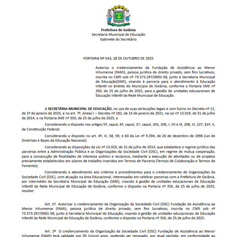 FAMI É OFICIALMENTE CREDENCIADA PELA SECRETARIA MUNICIPAL DE EDUCAÇÃO DE GOIÂNIA No dia 28 de outubro de 2025, foi publicada a Portaria nº 543/2025, que autoriza o credenciamento da Fundação de Assistência ao Menor Inhumense (FAMI) junto à Secretaria Municipal de Educação (SME), para atuar na gestão de unidades educacionais de Educação Infantil da Rede Municipal de Educação de Goiânia. Com essa autorização, a FAMI passa a integrar de forma oficial o quadro de Organizações da Sociedade Civil (OSC) habilitadas a colaborar com o poder público municipal, fortalecendo a oferta de uma educação infantil de qualidade, pautada em princípios de cuidado, inclusão e desenvolvimento integral das crianças. O credenciamento tem validade de cinco anos, podendo ser renovado, e reforça o reconhecimento da FAMI como uma instituição séria, transparente e comprometida com o avanço das políticas públicas voltadas à infância e juventude. Seguimos firmes na nossa missão de cuidar, educar e transformar vidas, agora também com um novo capítulo em Goiânia! Baixar Portaria nº 543/2025