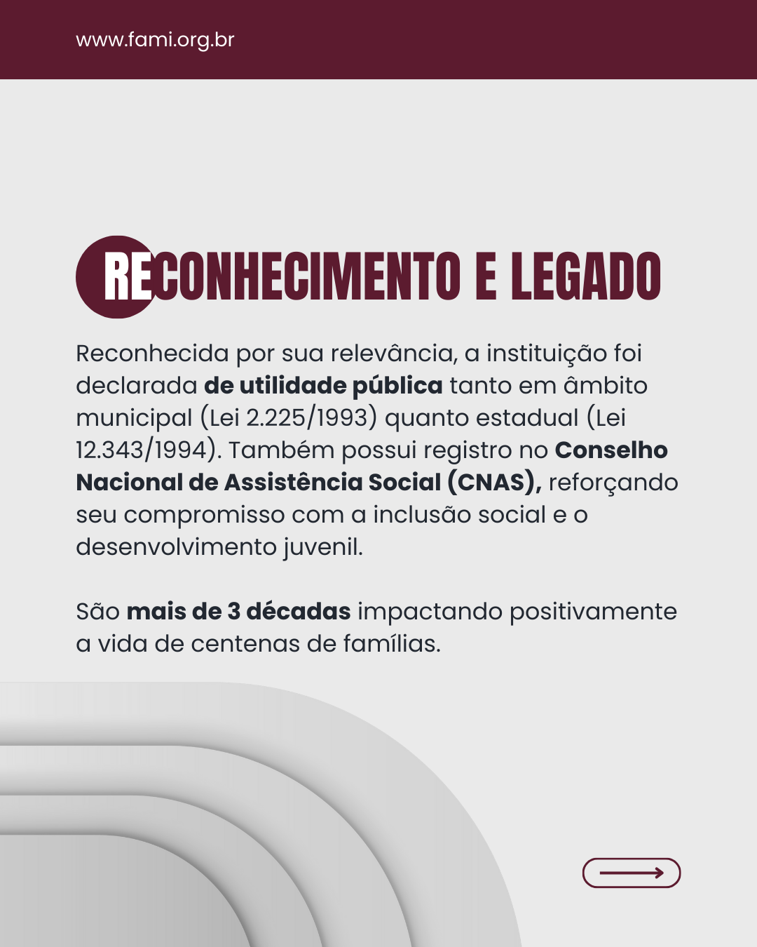 Aqui na Fami nossa missão é proporcionar às crianças e adolescentes uma experiência desportiva, artística, cultural, social bem como a promoção, proteção e defesa de seus direitos.